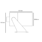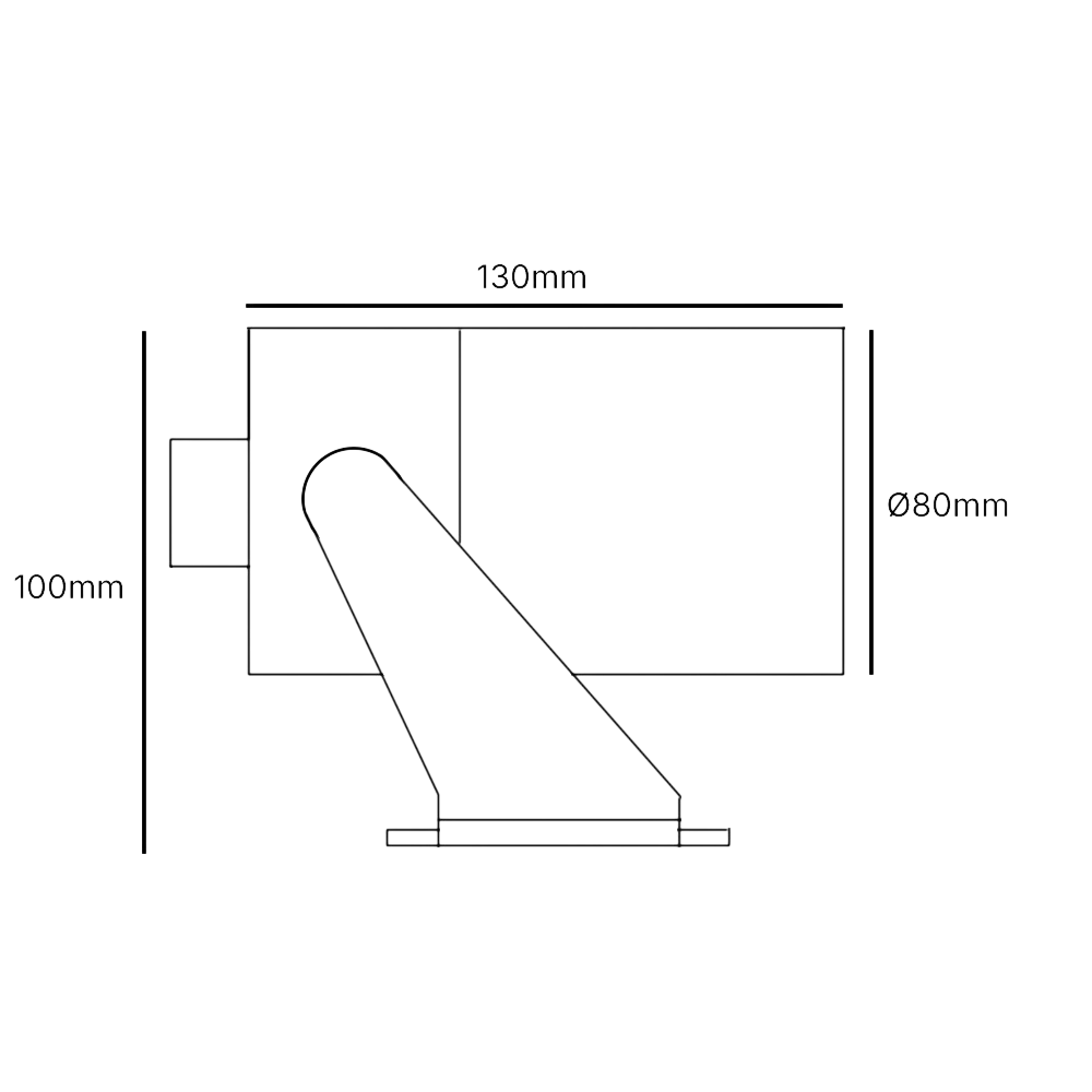 Mått 130 × 80 × 100 mm. Levereras med montagebygel och anslutningskabel. Markspett och visor (snedskuret bländskydd) finns som tillbehör.