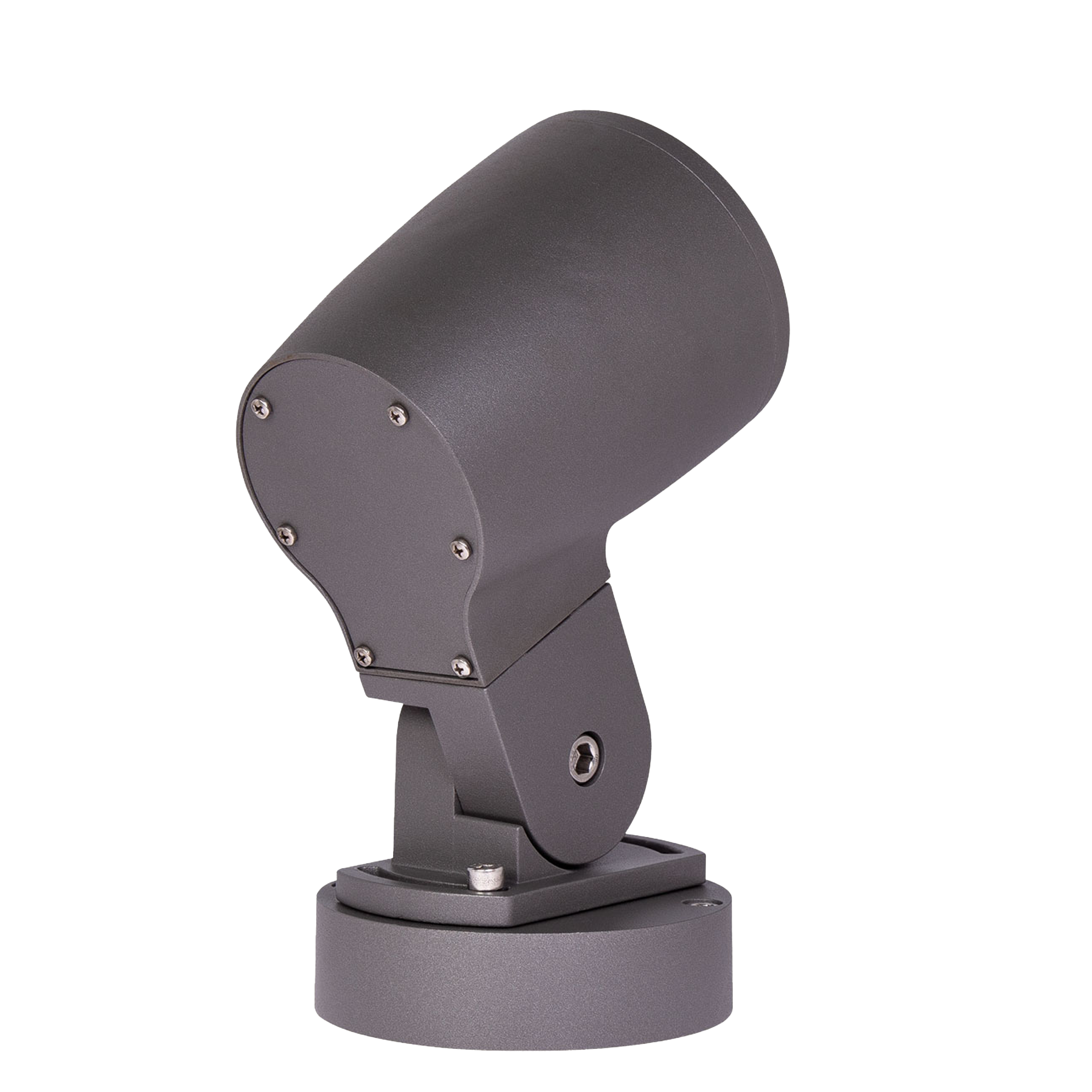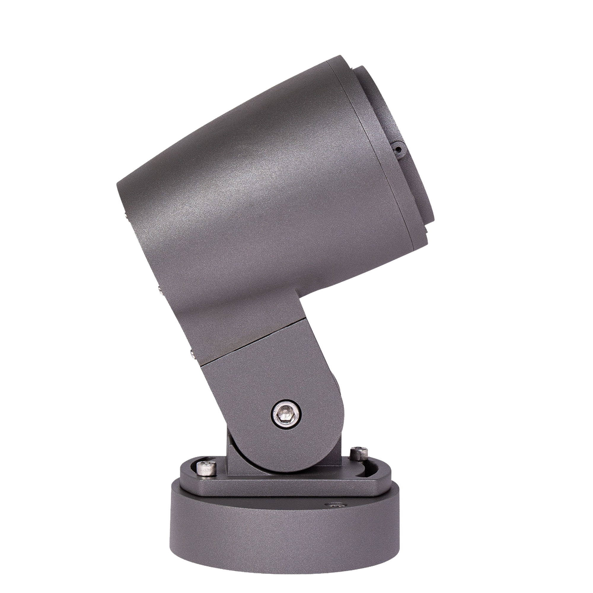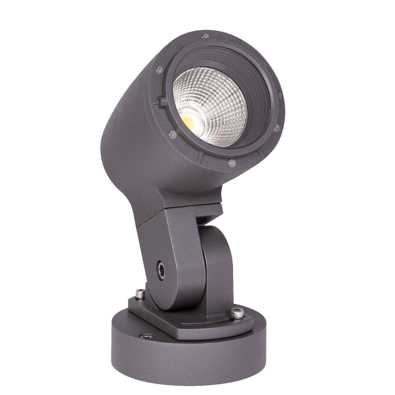 Thora Midi är en riktbar spotlight i gjuten aluminium för utomhusbelysning. Armaturhuset är 135 mm och monteras på en 150 mm fot. Den kan vridas 45° och tiltas 150° för exakt riktning av ljuset.