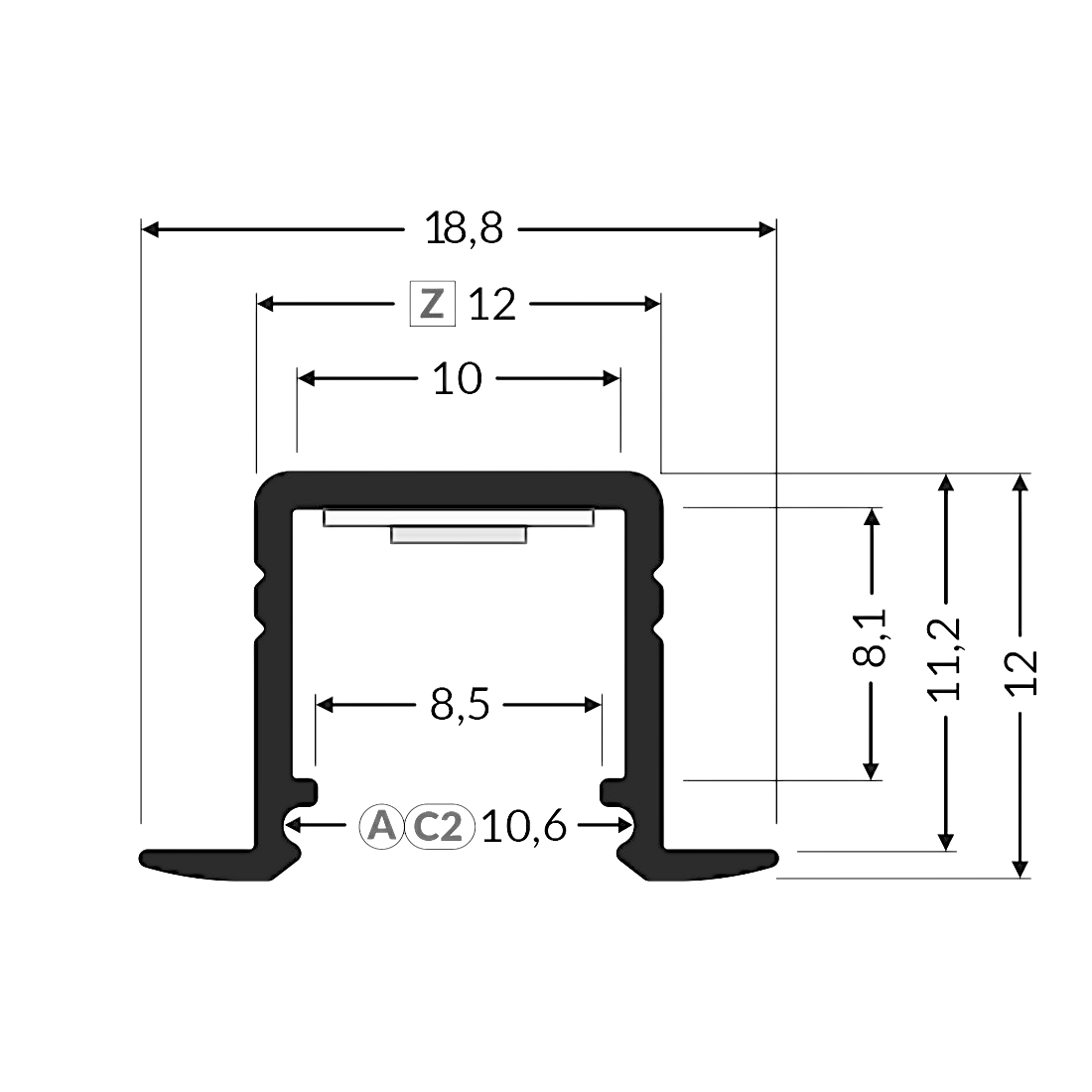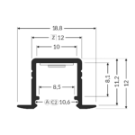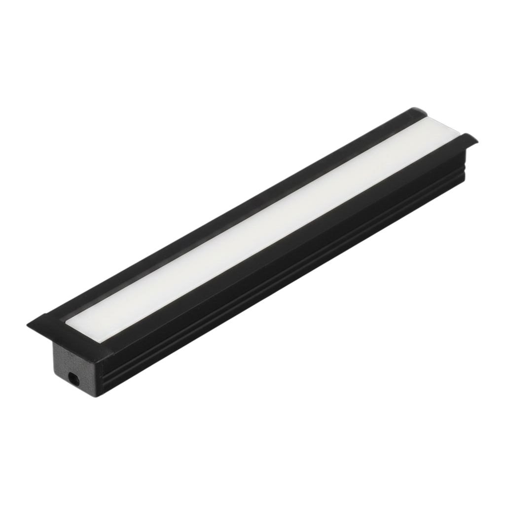 T-profil 12.11 är en måttanpassad LED-profil för infällt montage i tak, vägg eller inredning. Den kan exempelvis används som arbetsbelysning i kök, garderober eller exponeringsbelysning i butiker där du vill ha ett infällt montage. Den täckande kanten döljer ojämnheter i spåret och ger en snygg avslutning. Profilen är 18,8 mm bred och 11,2 mm hög.